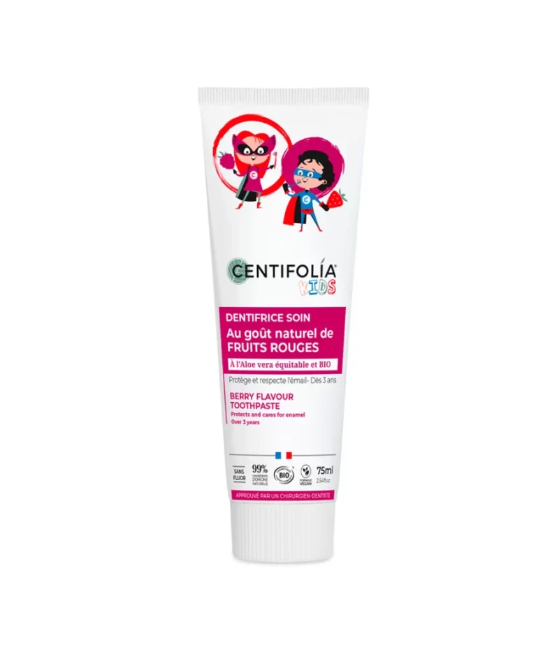 Za svoj asortiman dječjih pasta za zube, Centifolia je odabrala najnježnije aktivne sastojke koje priroda može ponuditi. Formula, neodoljivog okusa crvenog voća, posebno je dizajnirana za njegu dječjih mliječnih zubića*. Ova nježna pasta za zube čisti, štiti i hrani zubnu gleđ. Pomaže u zaštiti osjetljivih desni vaše djece za savršenu oralnu higijenu. Čišćenje zuba čini dječjom igrom.